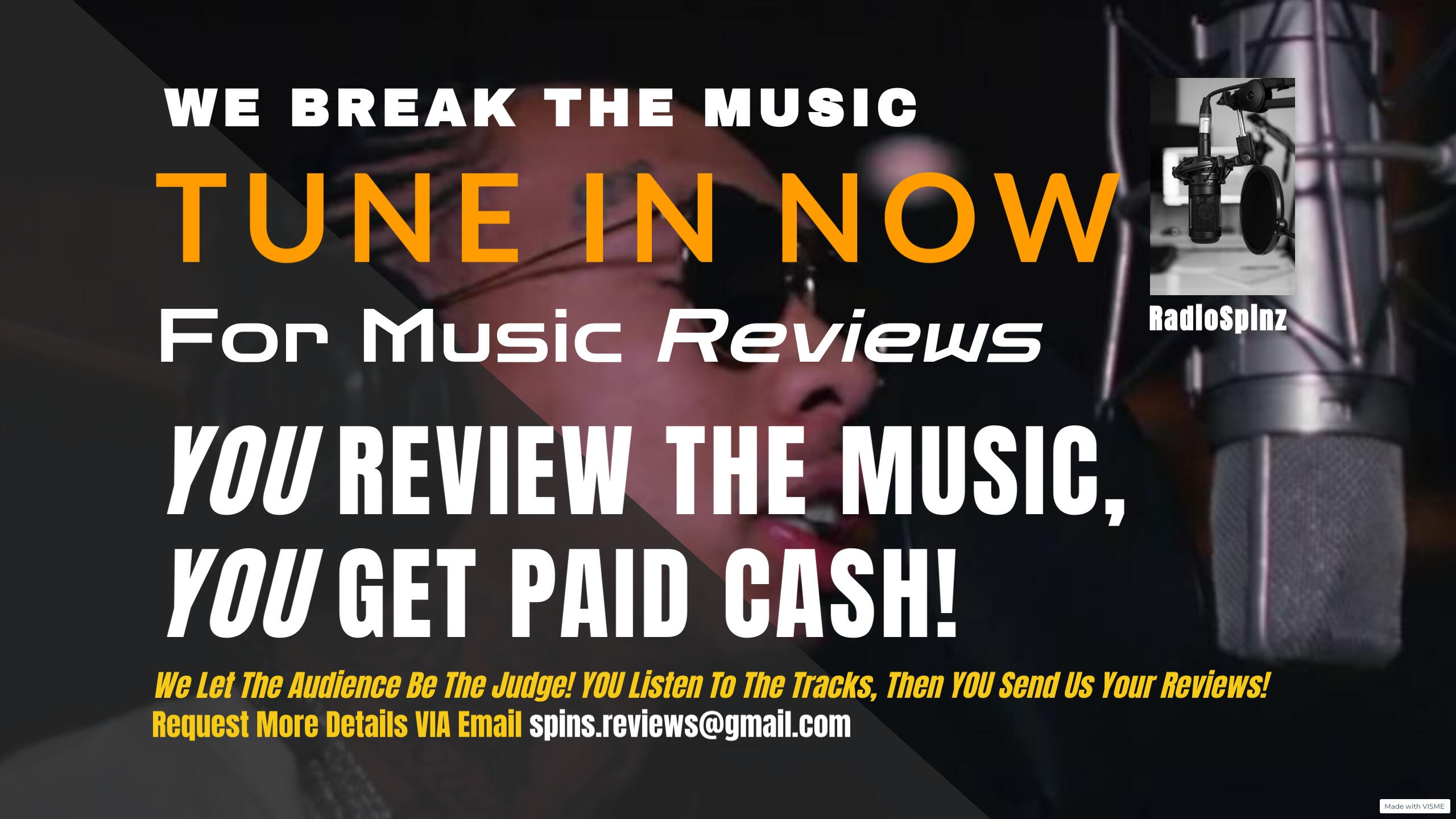 Thanks for joining the audience at RadioSpinz. This is the radio program where you get paid cash for reviewing the tracks from our playlist. If you have submitted a music review for tracks from our playlist please wait for a response from our admin so that we can begin processing your payment. If this is your first time contacting us and you want to learn how to begin reviewing tracks from our playlist so that you can get paid, please follow the instructions provided below.